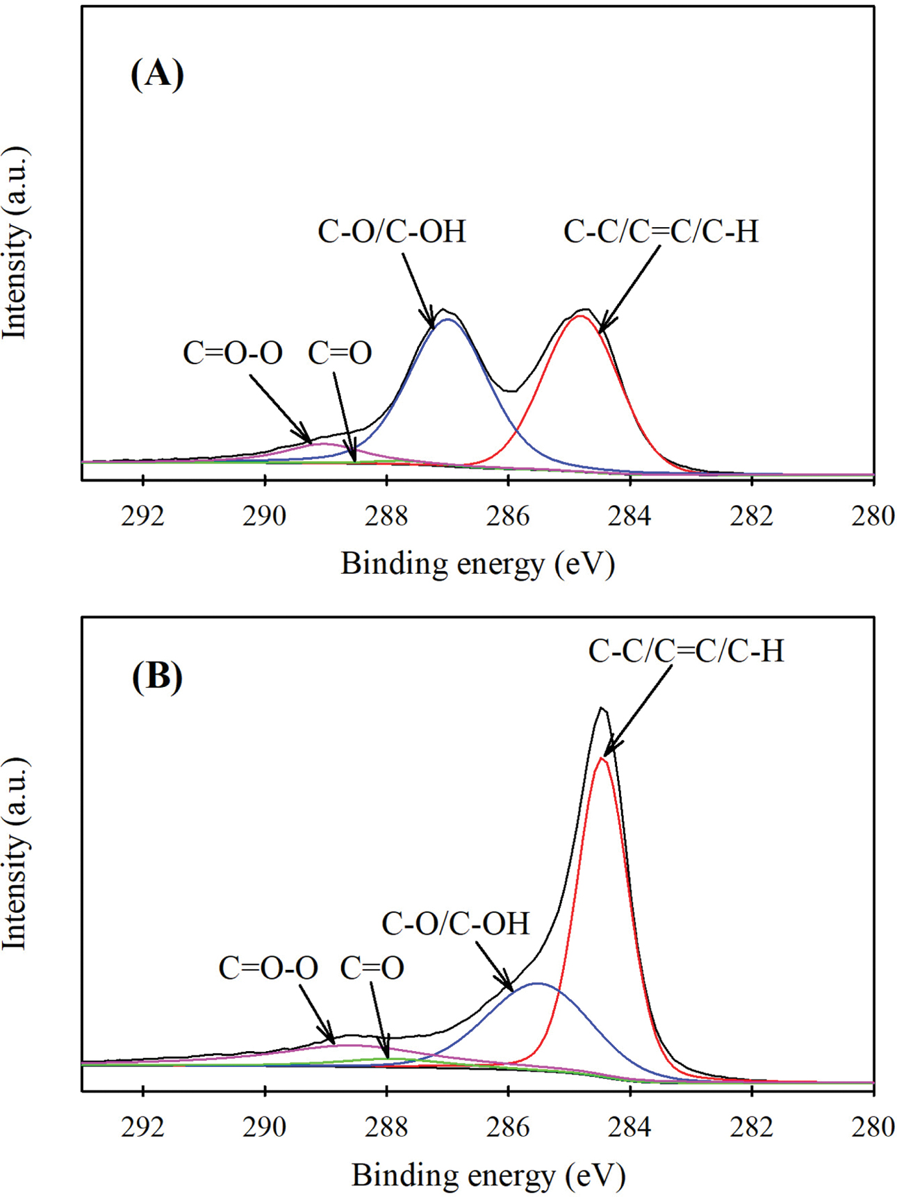 High resolution C1s XPS spectra of (A) GO; (B) GO-g (6.4%)-PCL(1250) with peak separation of each functional group.