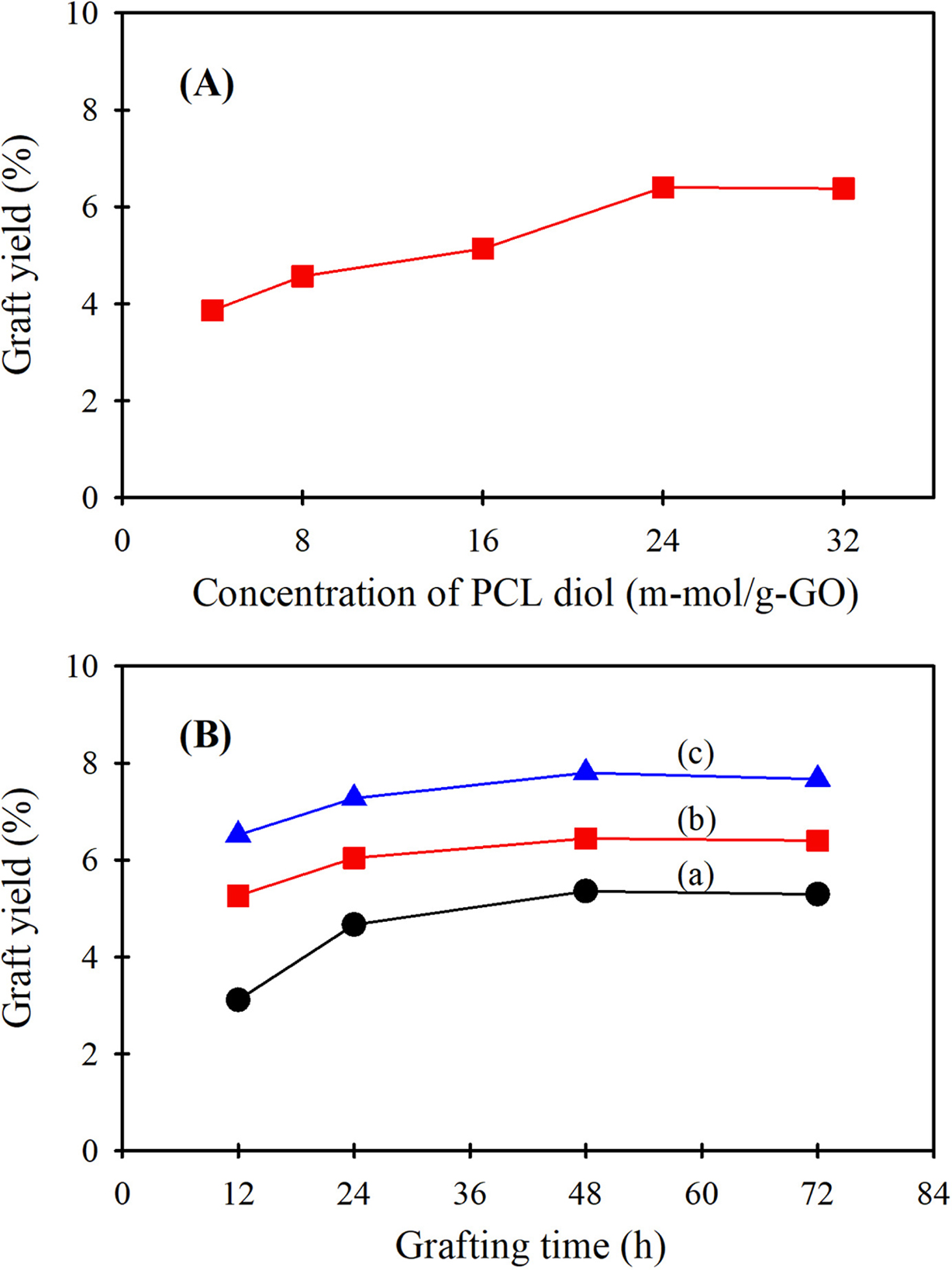 Changes in graft yield with (A) increasing PCL diol concentration at 50 °C for 48 h using PCL diols of MW of 1250 g/mol; (B) increasing grafting time at 50 °C using PCL diols of MW of (a) 530 g/mol; (b) 1250 g/mol; (c) 2000 g/mol.