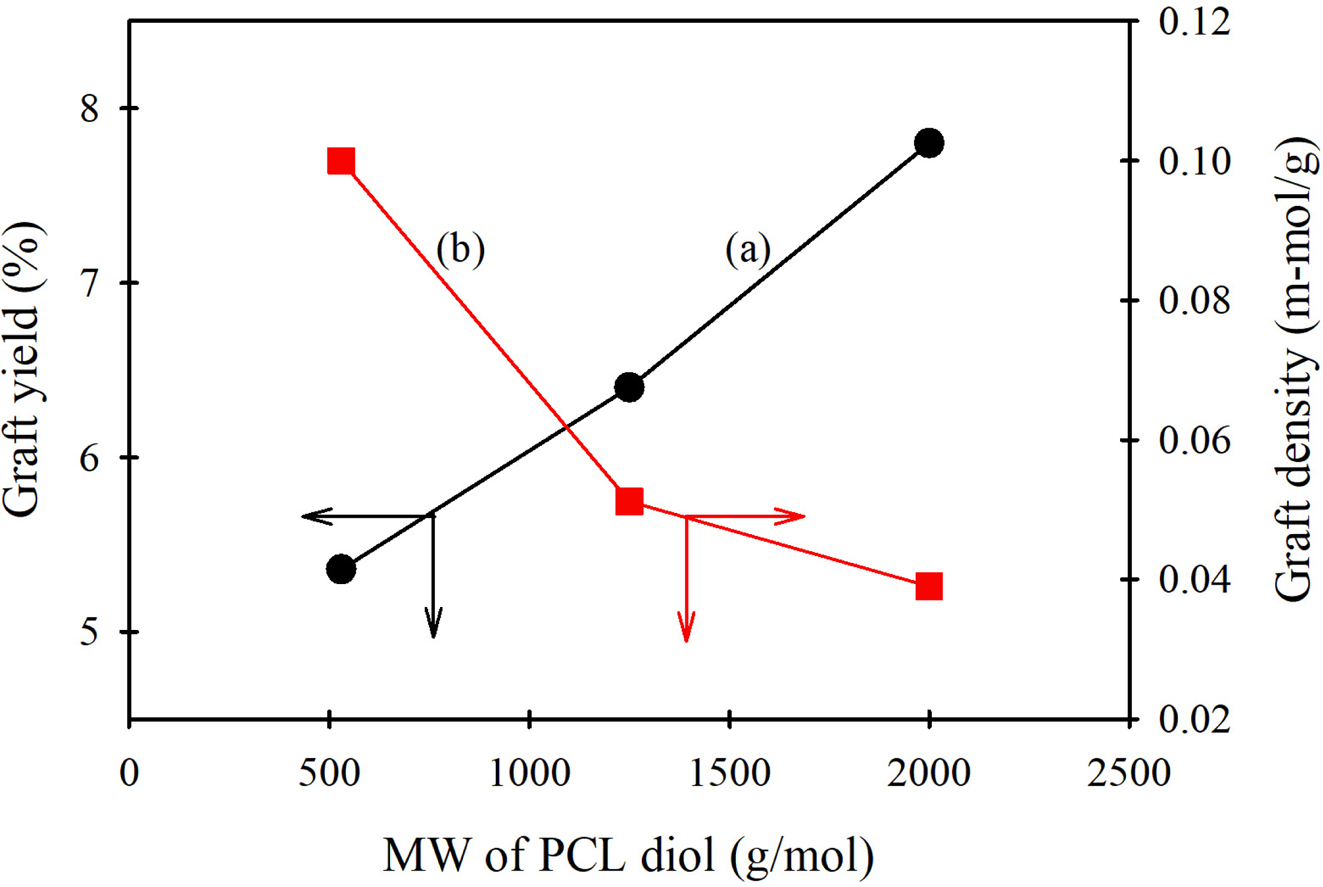Figure 9(B)에서 전체적으로 볼 때 사용한 PCL 디올의 분자량이 커질수록 그래프트율은 커졌으며, 분자량이 530→1250→2000 g/mol로 약 2.36배 및 3.78배 증가하였지만 48시간 반응시킨 시료의 그래프트율은 각각 5.4, 6.4, 7.8%를 나타내고 있어 그 값이 상대적으로 약 1.19배, 1.44배 증가하였다. 이는 PCL 디올의 분자량이 커지면 동일한 개수의 PCL이 그래프트되는 것이 아니라 그래프트되는 분자 수는 상대적으로 적어졌음을 나타낸다. 분자량이 큰 PCL 디올의 경우, 그래프트된 분자수는 작지만 분자량이 커서 그래프트율은 상대적으로 큰 값을 나타내었다. 이를 좀 더 구체적으로 분석하기 위하여 GO 무게 1 g 당 그래프트된 PCL의 몰수인 그래프트 밀도(graft density)와 연관지어 고찰하였다. Figure 10은 530, 1250, 2000 g/mol의 3가지 분자량의 PCL 디올을 그래프팅하여 얻어진 각각의 최대 그래프트율과 이를 그래프트 밀도로 환산하여 같이 나타낸 것이다. PCL 디올의 분자량이 증가하면 그래프트율은 차례대로 각각 5.4, 6.4, 7.8%로 증가하였고 그래프트 밀도는 차례대로 각각 0.10, 0.05 및 0.04 m-mol/g로 감소하여 그래프트시키는 PCL의 분자량이 클수록 그래프트된 PCL 분자의 수가 적어졌다. 이는 분자량이 큰 PCL은 분자량이 작은 것보다 그래프팅 후 상대적으로 큰 입체적 공간을 차지하기 때문에 이웃하여 그래프트되는 PCL 분자 수에 제한을 주기 때문이다.