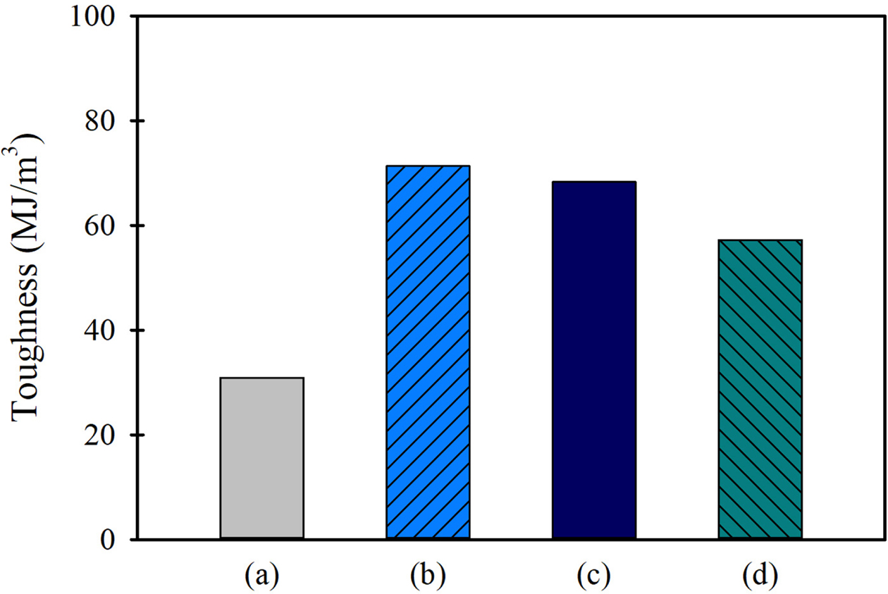 Toughness of PVC/GO-g-PCL composite films containing 0.3 wt% GO-g-PCL prepared from different MW of PCL. (a) neat PVC; (b) PVC/GO-g(5.4%)-PCL(530); (c) PVC/GO-g(5.3%)- PCL(1250); (d) PVC/GO-g(5.5%)-PCL(2000).