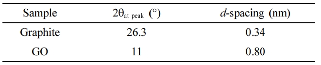 GO의 합성. GO는 Hummers 법을17 참고하여 다음과 같이 합성하였다. 98 wt% 황산 70 mL, 질산나트륨 1.5 g 및 흑연 2 g을 반응조에 넣고 얼음물을 채운 배스에 반응조를 넣어 0 °C 이하로 유지하면서 균일하게 교반하였다. 여기에 과망간산칼륨 12 g을 천천히 첨가하여 0 °C를 계속 유지하면서 30분간 교반한 후 얼음물 배스를 제거하였다. 이후 상온에서 갈색이 될 때까지 충분히 교반한 후, 물 280 mL를 천천히 첨가하여 교반하고 과산화수소 10 mL를 첨가하였다. 과산화수소 첨가에 의해 반응액이 오렌지색으로 변한 것을 확인한 후, 5% 염산과 탈이온수로 수세와 원심분리를 수차례 반복하여 수분산액으로 만들었다. 만들어진 수분산액을 Spectrumlabs사의 재생 셀룰로오스(regenerated cellulose, RC) 멤브레인 튜브(12~14 kD)에 넣고 탈이온수로 48시간 투석하여 금속 이온과 산을 제거한 후, 5 mTorr로 감압하여 -70 °C에서 3일간 동결 건조하여 GO 분말을 얻었다.