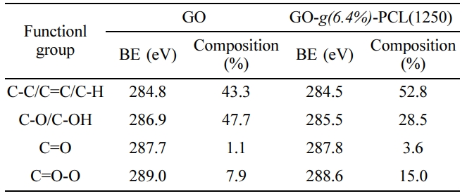 이러한 TGA 설명을 뒷받침하기 위하여 XPS 분석을 통해 시료들의 원소 조성비를 알아보았다. Figure 8은 TGA 분석 시료와 동일한 GO 및 GO-g(6.4%)-PCL(1250)의 C1s에 대한 XPS 스펙트럼을 나타낸 것이며, Table 2는 각 관능기의 특성 피크에 해당하는 결합에너지 및 조성비를 구하여 나타낸 것이다.27,28 GO와 비교했을 때 GO-g-PCL은 C-C/C=C/C-H의 양이 상대적으로 많아졌고, C-O/C-OH의 양은 상대적으로 적어졌으며, C=O 및 C=O-O의 양은 상대적으로 많아졌다. 이는 그래프팅에 의해 GO에 PCL이 도입됨에 따라 PCL 주사슬의 C-C 및 C-H의 상대적인 양이 많아졌고, 염화아실화 및 그래프팅 중 용매열적 환원에 의해 GO에 있던 산소함유 관능기의 양이 감소하여 C-O 및 C-OH의 상대적인 양이 줄어들었으며, PCL 주사슬의 에스테르기의 증가에 의해 C=O-O 및 C=O의 상대적인 양이 많아진 것으로 해석할 수 있다. 이러한 결과로부터 GO-g-PCL 시료는 염화아실 유도체화 및 PCL의 그래프팅 과정에서 PCL 분자가 도입되고, 용매열 환원에 의해 일부 산소함유 관능기는 감소되었다는 것을 확인할 수 있다.