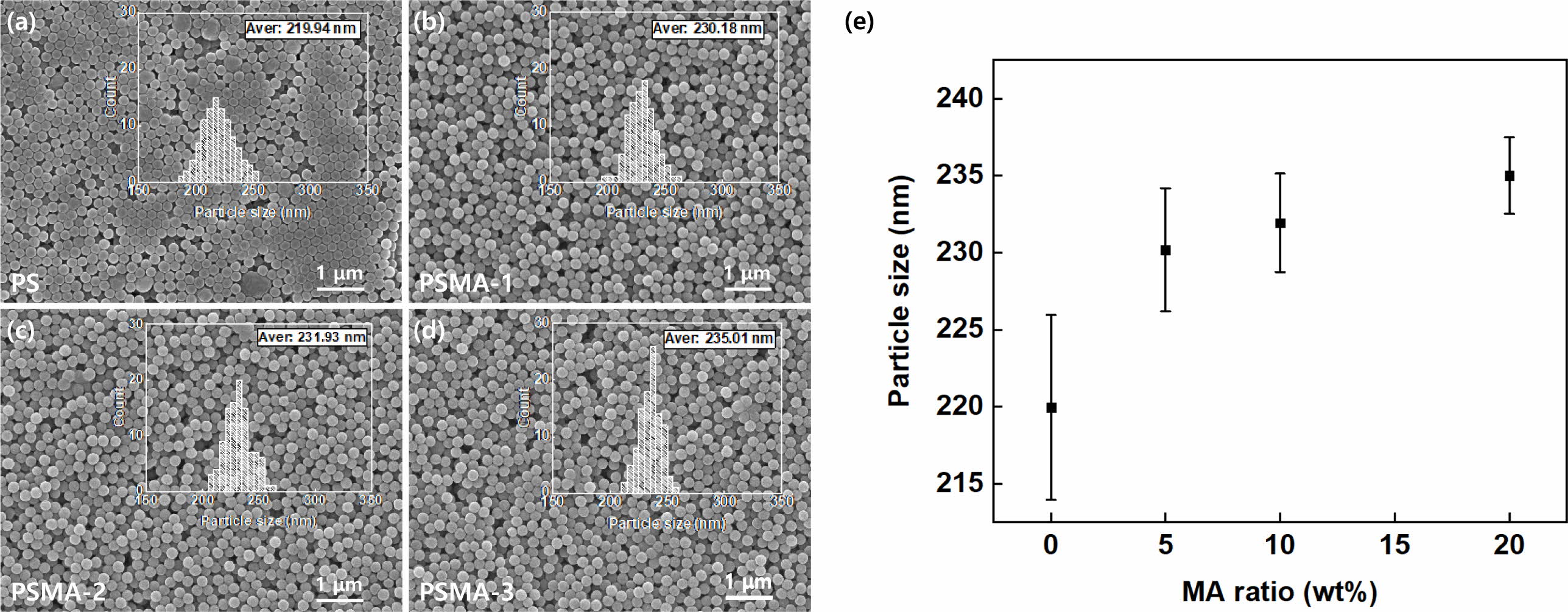 Particle size distribution of PSMA. (a-d) SEM images of PSMA nanoparticles prepared with different MA ratios; (e) particle size dependence on MA ratio in PSMA nanoparticles.
