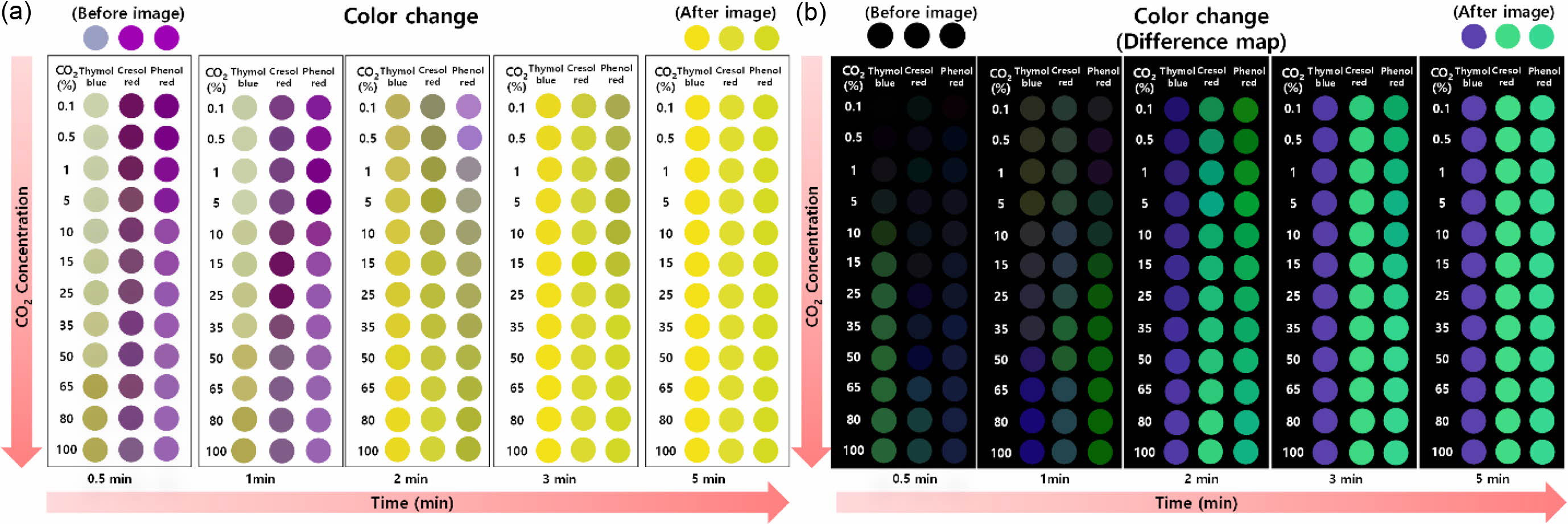 Colorimetric responses ((a) ΔRGB values; (b) difference map) of phenol red, cresol red, and thymol blue sensors prepared with various CO2 gas ratios (0.1-100) on exposure to 5 min.