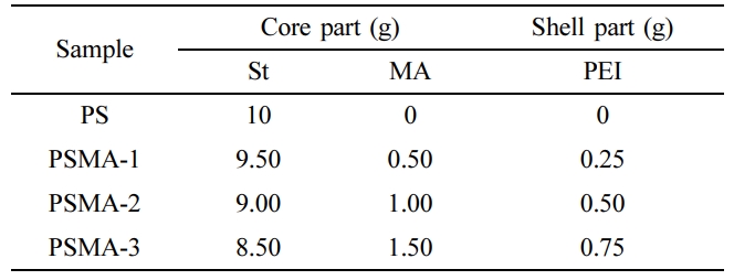 코어-쉘 CO2 가스 센서 제조. 이전 연구의 코어-쉘 입자제조22 방법에 따라 Scheme 1과 같이 수행하였다. 250 mL 이중자켓 반응기에 환류 냉각기를 설치하였다. 준비된 반응기에 진공 순환 펌프를 작동하고 70 oC의 온도로 승온시키며 질소 분위기를 유지시켜 주었다. 이후 교반기를 사용하여 300 rpm으로 무유화중합으로 PSMA를 제조하였다. MA 5~15 wt%를 D.I water 155 mL에 첨가한 뒤 준비된 반응기에 넣고, 10분 동안 교반시켜 주었다. 정제된 St 85~95 wt%를 MA가 용해된 반응기에 추가하여 30분간 교반시켜 주었다. 30분 후 수용성 개시제인 KPS 0.2 wt%를 D.I water 5 mL에 충분히 용해시켜 syringe pump(NE300)를 통해 10분간 0.5 mL/s의 속도로 투입시켜 주었다. 개시제의 투입이 끝나고, 5시간 동안 중합을 진행하였다. 중합 반응이 끝난 뒤 30 oC까지 빠르게 온도를 낮추어 무유화중합을 완료하였다. PSMA의 MA에 도입될 PEI는 1차 아민의 수를 기준으로 투입하였다. PEI는 1몰당 569개의 자유 아미노 그룹(free amino groups)을 가지는데, 이 중 1차 아민, 2차 아민 및 3차 아민을 각각 37.5, 38.1 및 24.1%의 비율로 가지고 있다.24 이에 따라, 몰비로 MA와 PEI를 1:0.02로 부가하였으며, 구체적으로 증류수 10 mL에 PEI를 각각 투입하고 30분 동안 용해시켜 MA 몰비로 1:0.02 PEI 용액을 제조하였다.