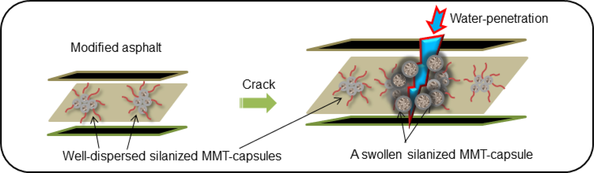 Figure 1 Schematic diagram of self-repairing waterproofing polymer-modified asphalt filled with silanized MMT-capsules. |