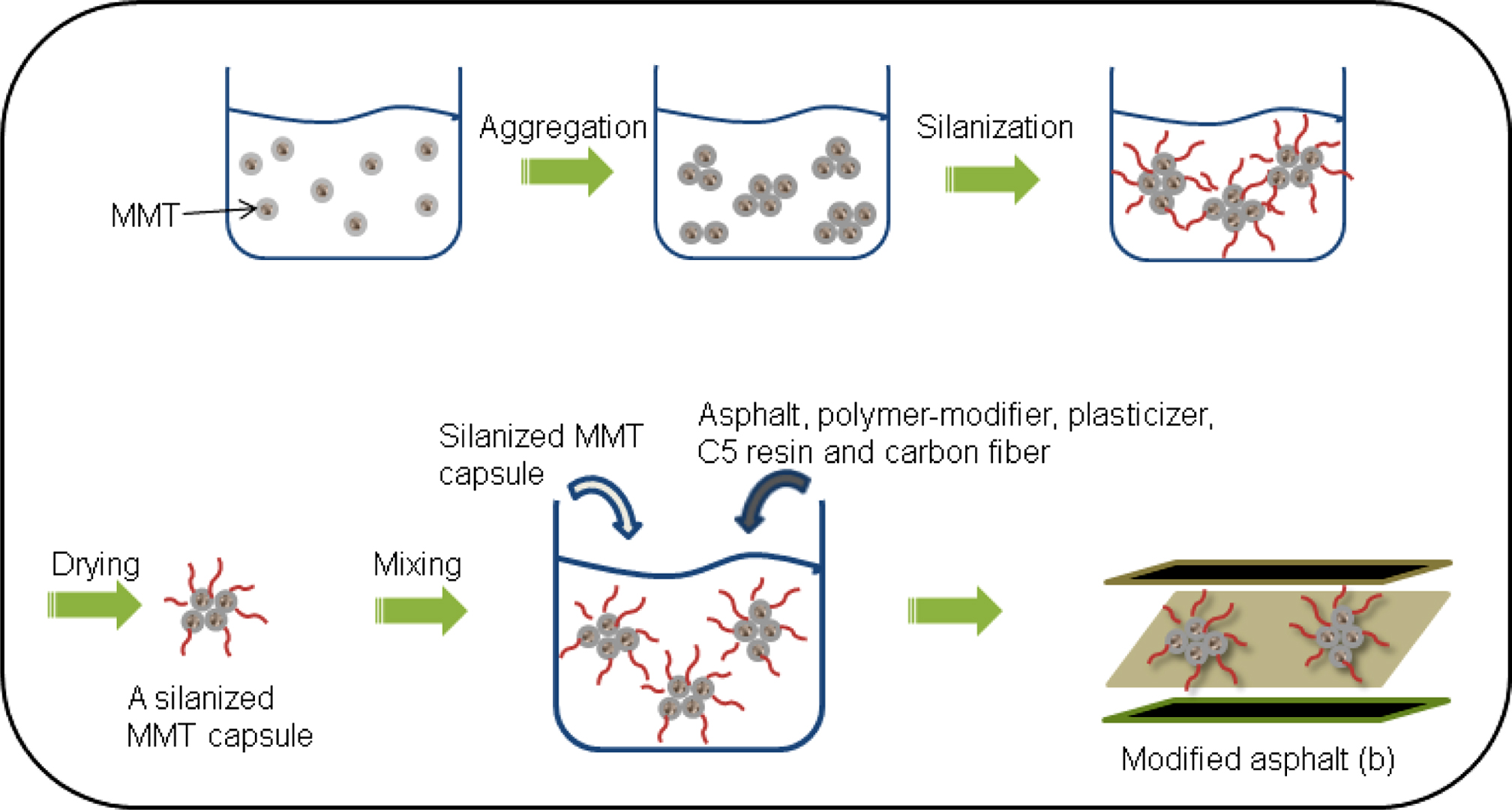 양이온 교환시킨 몬모릴로나이트(montmorillonite, MMT)를 응집시키고, 이러한 응집체의 표면을 고분자개질 아스팔트와 상용성이 있도록 실란커플링제인