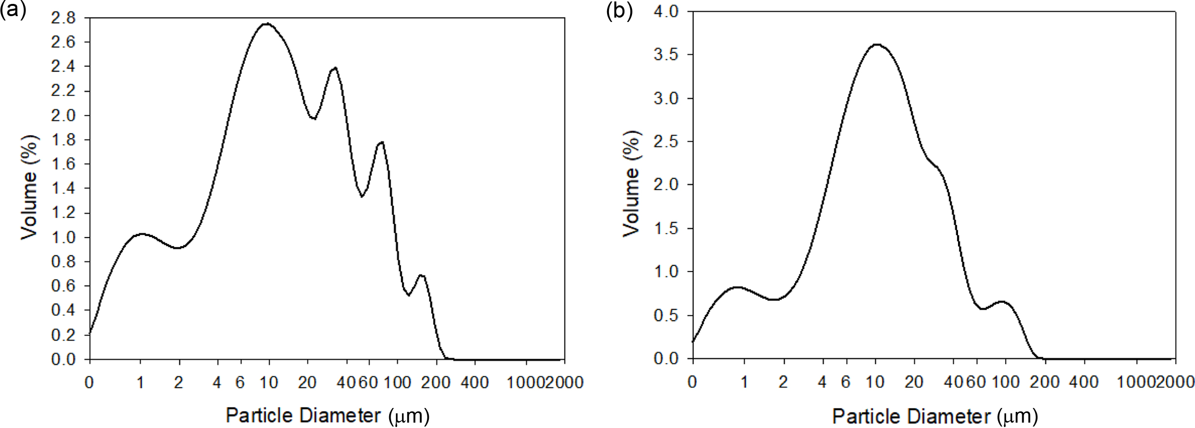 Figure 3 Size distribution of MMT measured by particle size analyzer (LS particle size analyzer, Beckman Coulter): (a) MMT; (b) Na-MMT. |