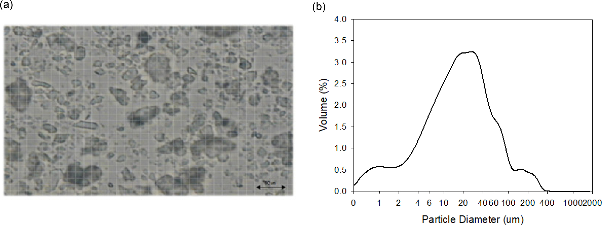 microscopy (×50); (b) size distribution measured by particle size analyzer (LS particle size analyzer, Beckman Coulter). |