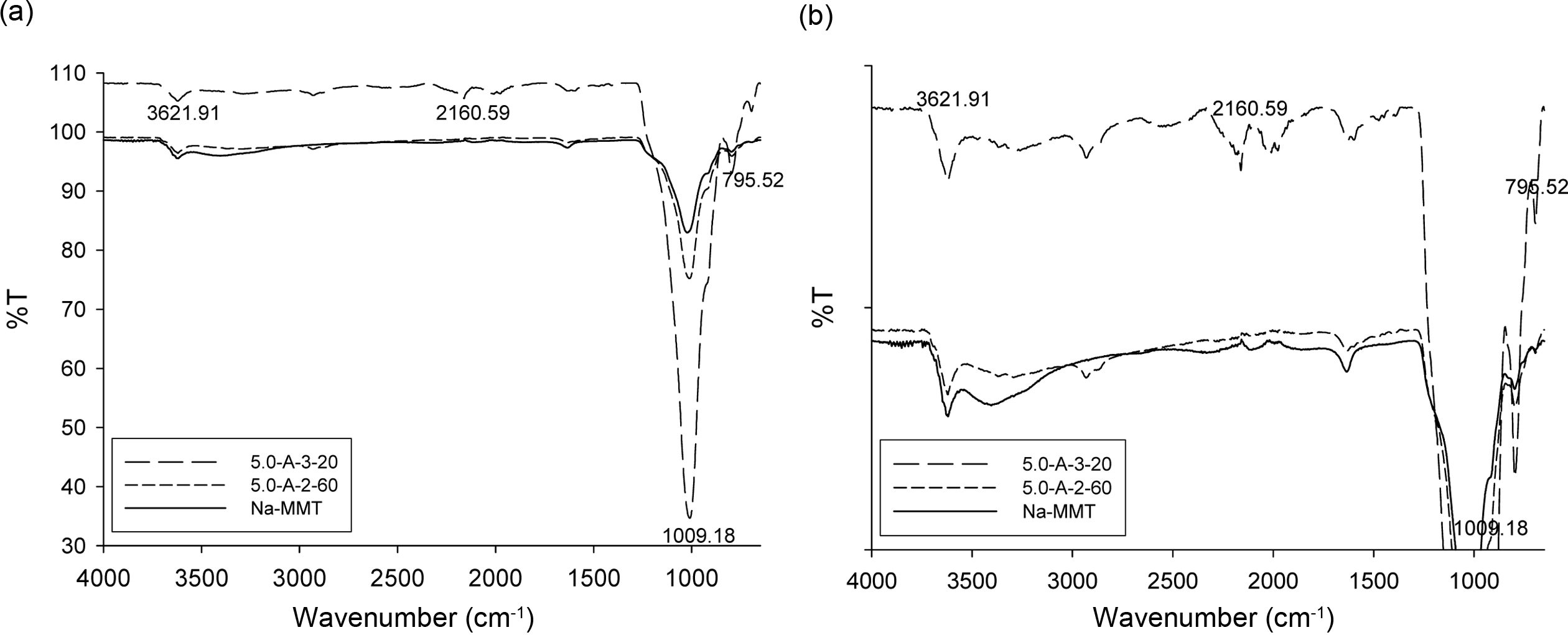 분석. Na-MMT와 A-5-3-20 조건에서 개질한 실란화