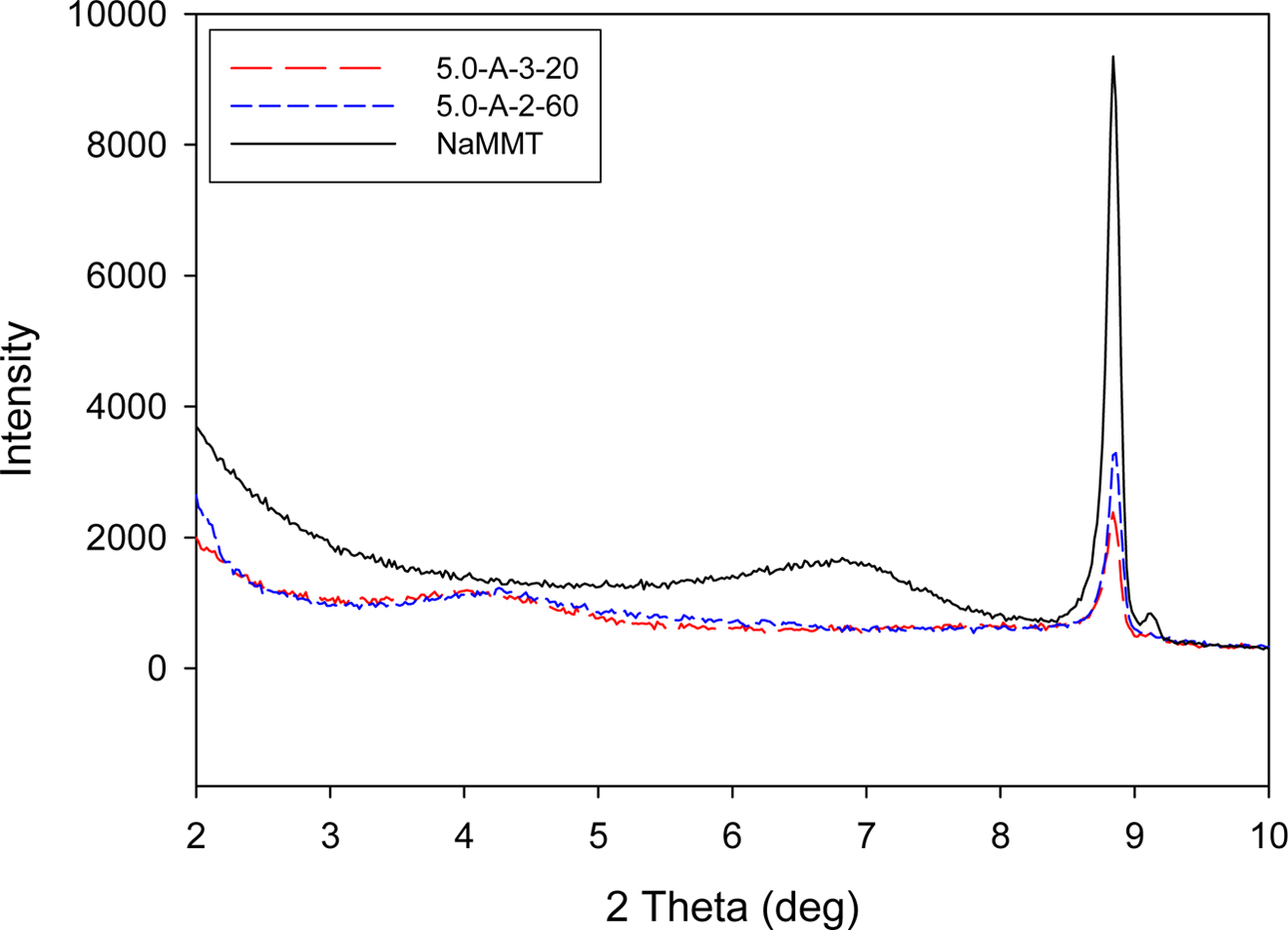 연구의 5.0-A-3-20과 5.0-A-2-60의 조건에서 개질된 실란화 MMT 캡슐들의 XRD 스펙트럼에서 Figure 6과 같이