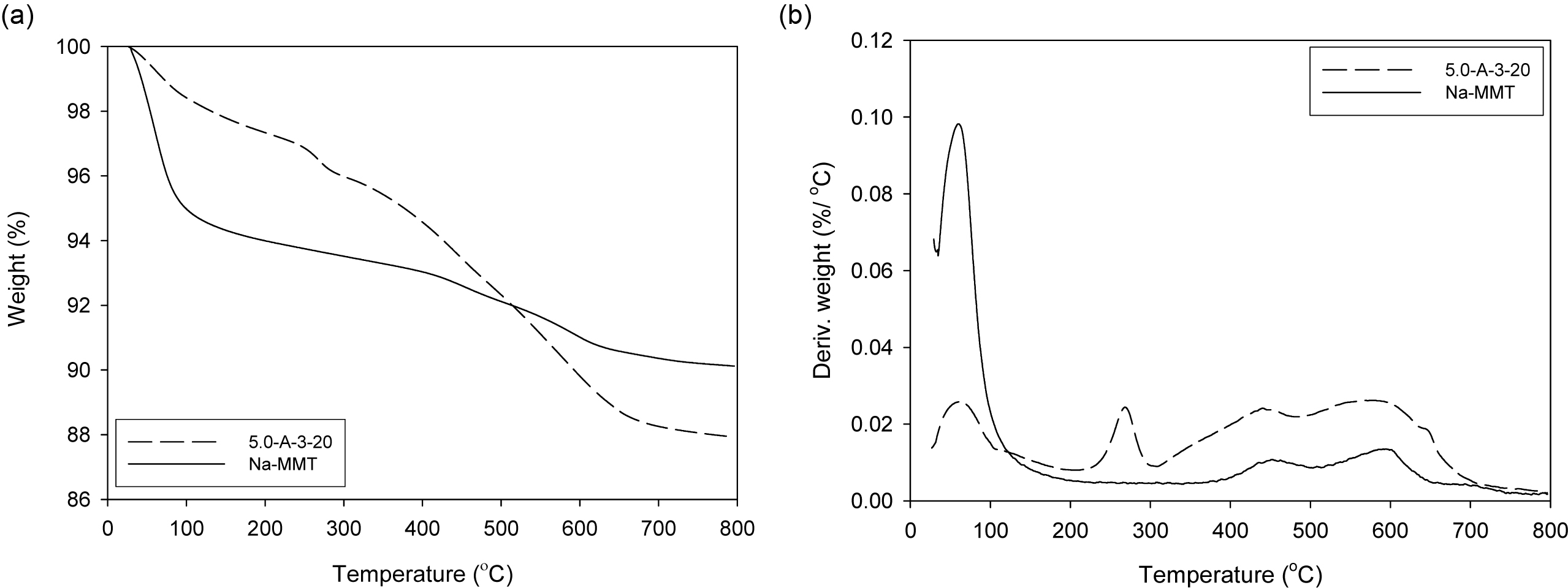 7.403%)은 TGA 분석에서 관찰된 1~3단계 총 온도구간에서 총질량감소율((i.e., 7.504%)과 거의 일치하였다. 한편, Na-MMT의 경우는 1~3단계 총 온도구간에서 총