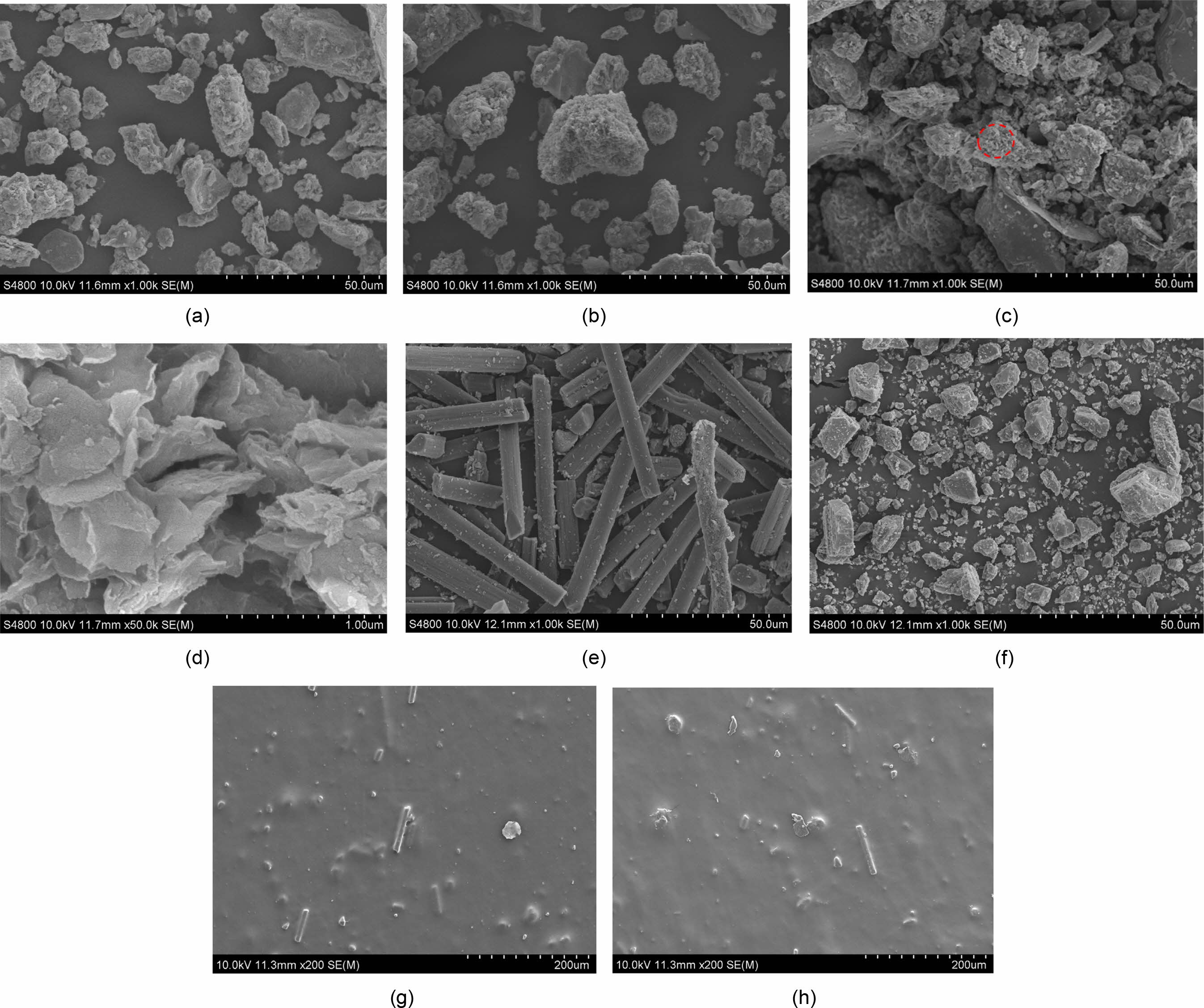 MMT-capsule in (c); (e) carbon fiber; (f) stearic acid-coated CaCO3; (g) hybrid waterproofing polymer-modified asphalt (a); (h) hybrid waterproofing polymer-modified asphalt (b). |