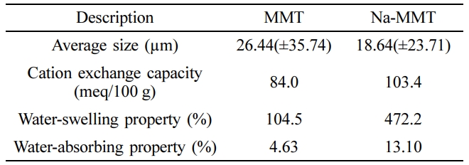 따른 Na-MMT를 제조하고, Na-MMT를 80% v/v 에탄올수용액에 첨가하고 교반 및 응집된 Na-MMT를 APS로 개질하여 실란화 MMT 캡슐을 제조하였다.