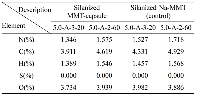 원소분석 및 FTIR 분석을 통해서 5.0-A-3-20의 APS 실란화 조건과 5.0-A-2-60의 APS 실란화 조건에서 실란화 MMT 캡슐