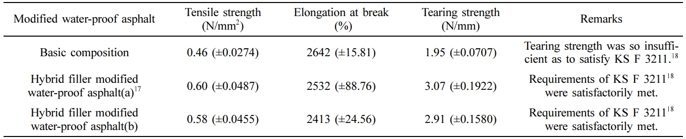 충전재가 첨가된 하이브리드 방수개질아스팔트(b)의 경우에 모두, 충전재가 첨가되지 않은 기본조성의 방수개질아스팔트와 다르게 규격 KS F 3211(인장강도: 0.3 N/mm2 이상, 파단신장률: