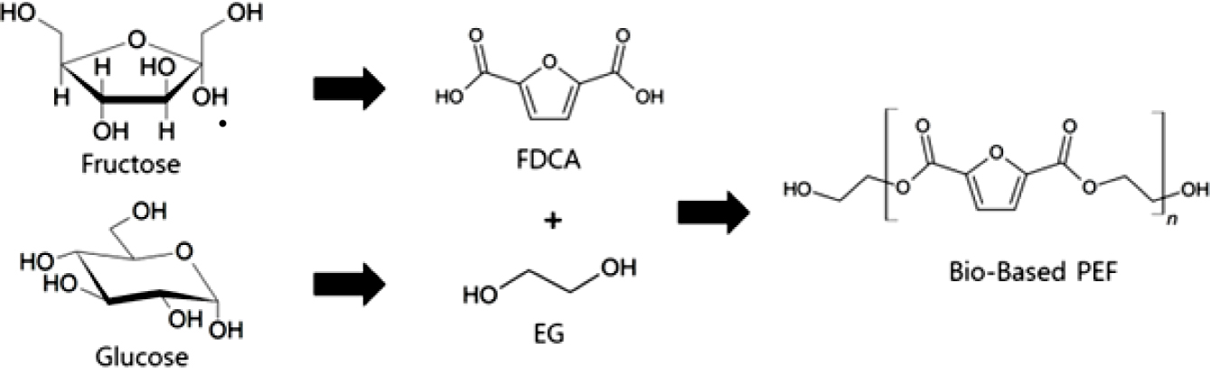 In modern society, poly(ethylene terephthalate) (PET) is used in a wide variety of fields, ranging from beverage bottles, films, and textiles. Replacing PET with bio-based materials can play a major role in environmentally sustainable development. The most promising alternative to PET is poly(ethylene 2,5-furandicarboxylate) (PEF).4,5 PEF is produced by polycondensation from ethylene glycol (EG) and 2,5-furandicarboxylate (FDCA). EG and FDCA can be obtained from renewable bio-based materials and subsequently used to make 100% bio-based polymers (Figure 1).5-7 FDCA is synthesized from fructose, the plant material, via 5-hydroxymethylfufural (HMF).7,8 In addition, it can be used as an alternative to terephthalic acid (TPA) due to its bio-based aromatic ring (furan ring).9,10 While PEF has a similar structure to PET, it has better gas barrier properties for use in the packaging and film market11,12 compared to PET with high thermal properties. Moreover, the PEF fiber is a promising sustainable bio-based material because it can be spun and dyed using conventional PET manufacturing facilities for apparel and industrial non-woven fabrics.