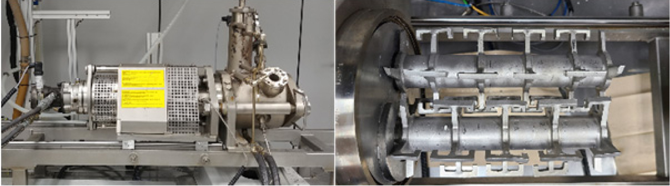 Kneader reactor (left) and twin shaft of kneader reactor (right).