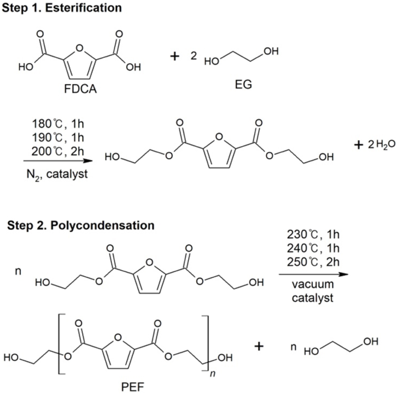 Synthesis of PEF. PEF synthesis was conducted in two steps: After the esterification reaction in the nitrogen purge state, PEF was synthesized by a polycondensation reaction in vacuum (Figure 3).