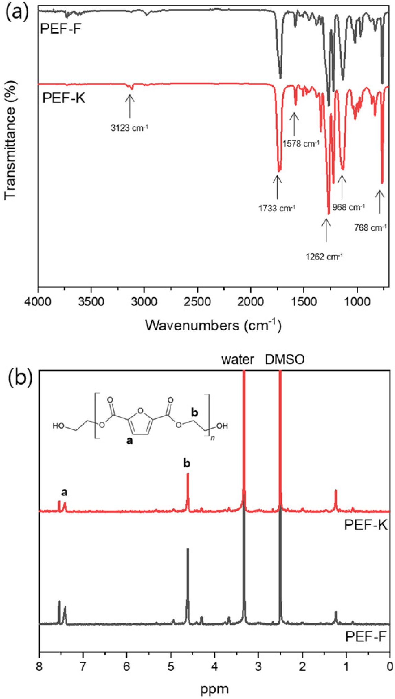 (a) FTIR spectra; (b) 1 H NMR spectrum of PEF-F and PEF-K.