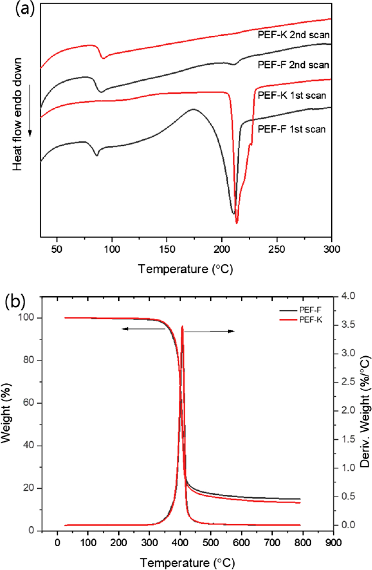 (a) DSC heat curves; (b) TGA thermograms of PEF-F and PEF-K.