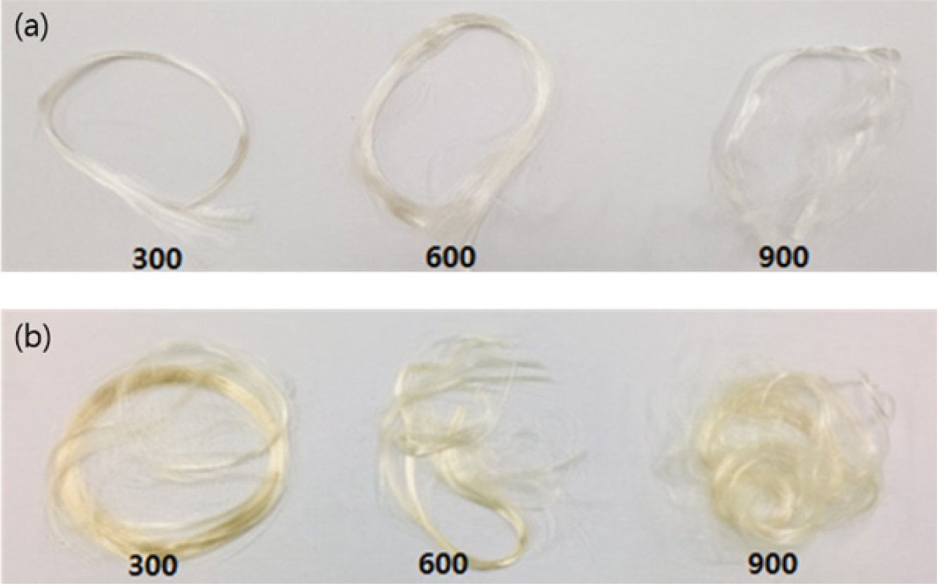 Melt spun PEF fibers at winding speeds of 300, 600, and 900 m/min: (a) PEF-F; (b) PEF-K.