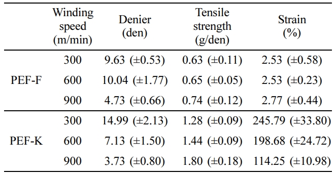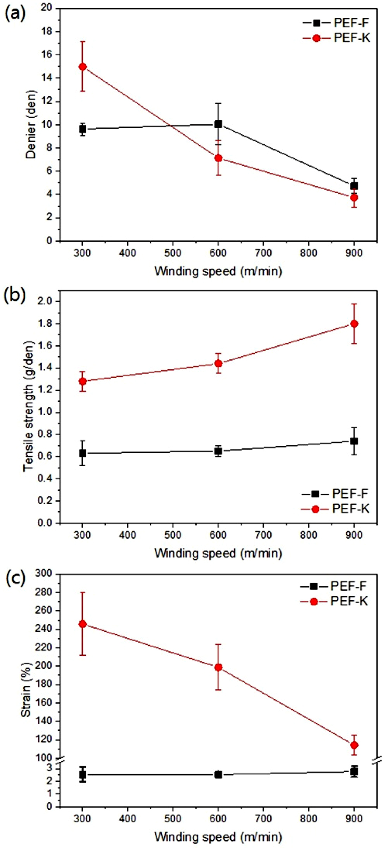 Tensile properties of PEF-F and PEF-K fibers: (a) denier; (b) tensile strength; (c) strain as winding speed.