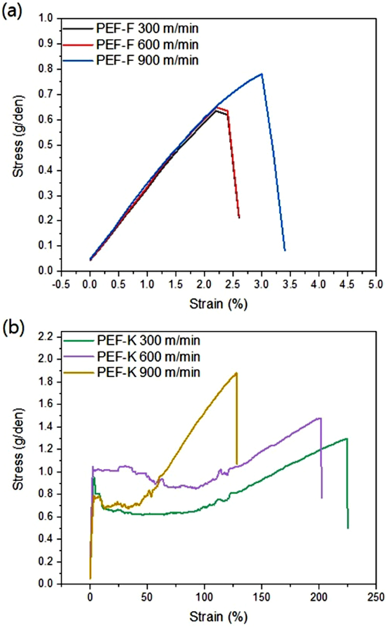 Stress-strain curves of (a) PEF-F; (b) PEF-K fibers.