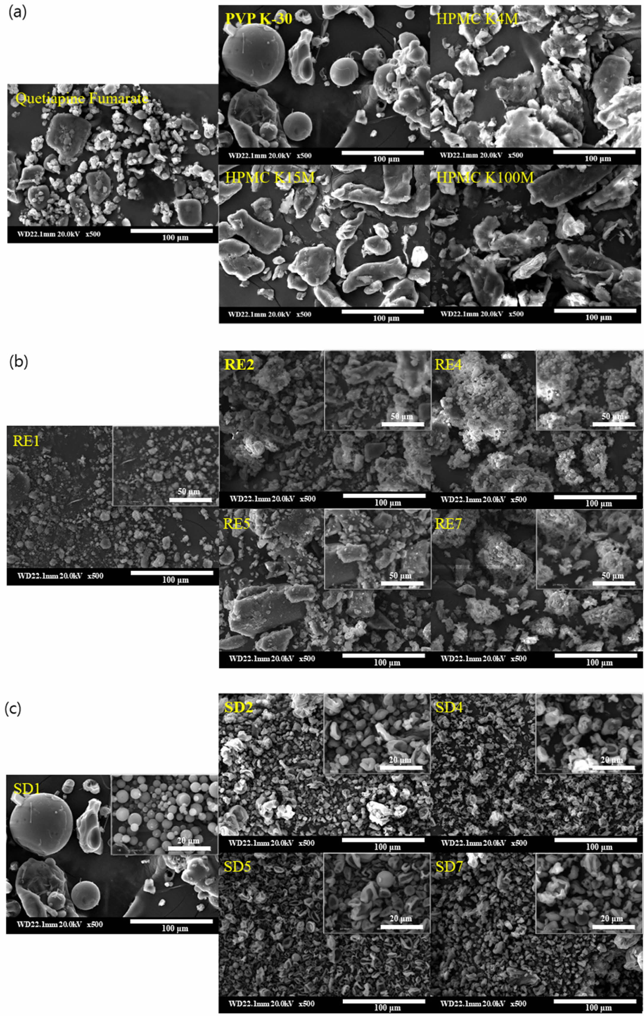 관찰한 결과를 Figure 2에 나타내었다. Figure 2(a)에서 QF 결정크기는 5~50 μm를 나타내었고, PVP K-30은 10~100 μm 크기로 구의 형태를 하고 있고, 입자끼리 뭉쳐있는 형태가 관찰되었다. HPMC는 10~100 μm 크기로 불규칙적인 형태의 모습을 볼 수 있다. Figure 2(b)에서 RE1은 1~10 μm, RE2, 4, 5, 7은 5~100 μm 크기의 불규칙적인 형태를 갖고있는 반면, Figure