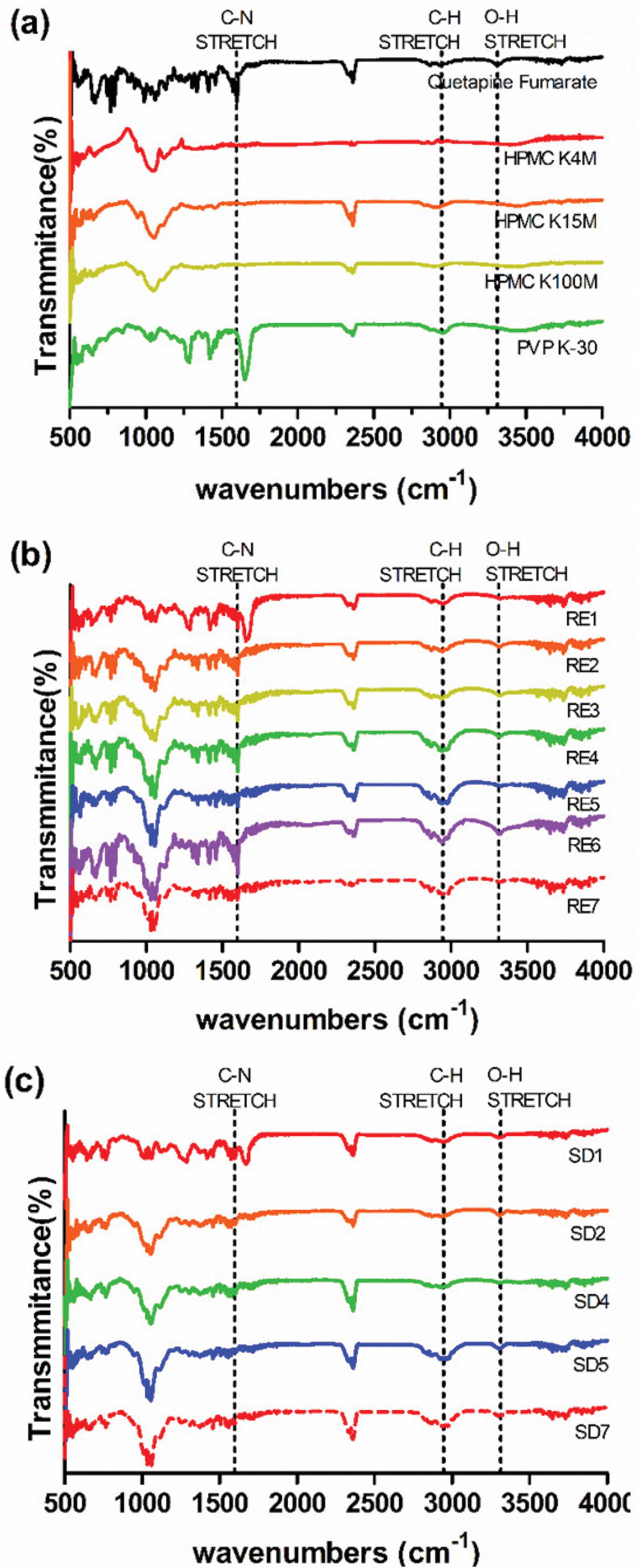 Figure 3 FTIR spectra of (a) quetiapine fumarate and polymers; (b)