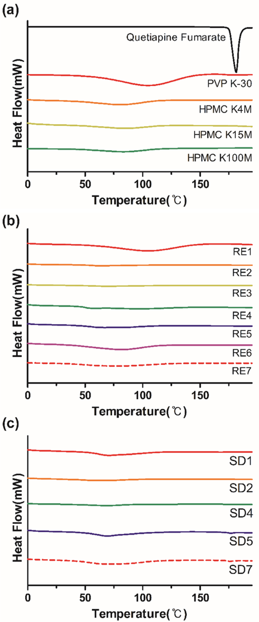 Figure 4 DSC thermograms of (a) quetiapine fumarate and polymers; (b) REs; (c) SDs. |