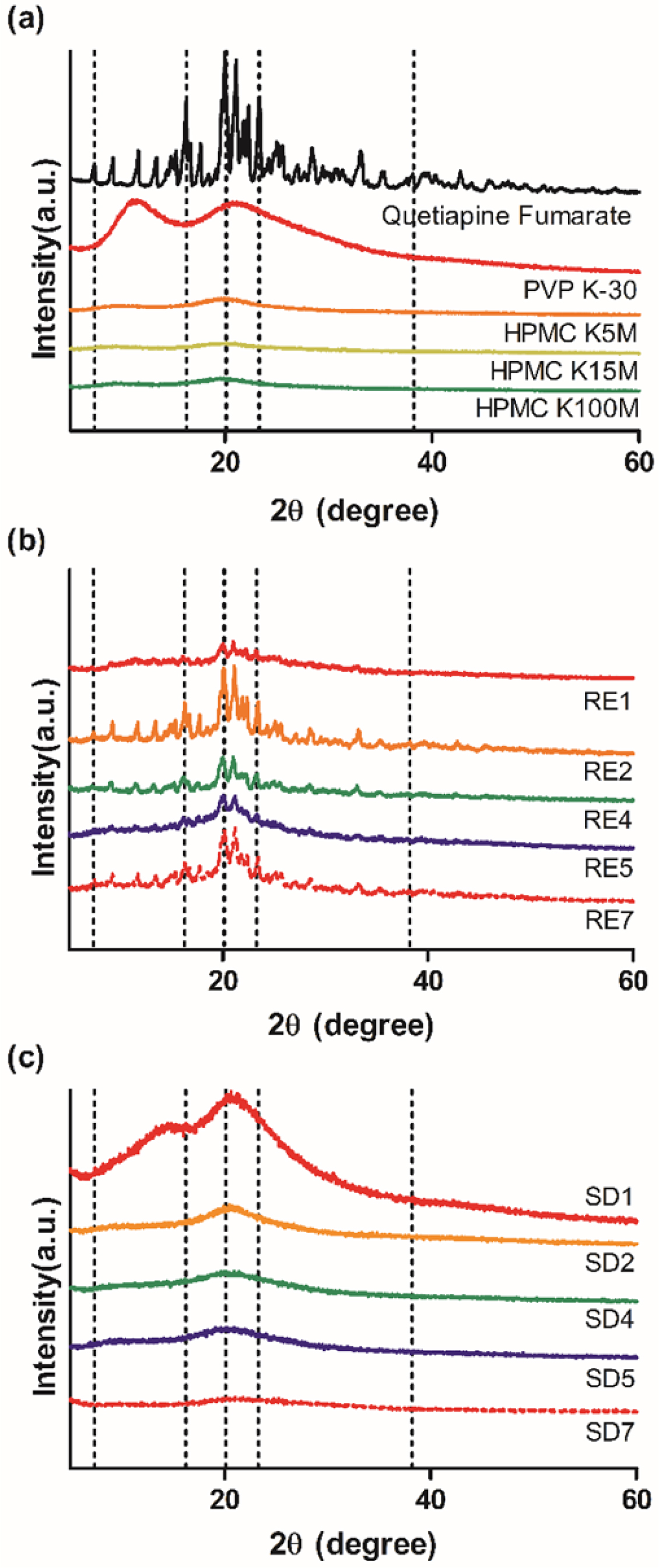 수 있다. 고분자들의 특징적인 피크가 없는 걸로 보아서 PVP K-30, HPMC들은 무정형 고분자임을 알 수 있다. Figure 4(b), 4(c)의 각 고체분산체의