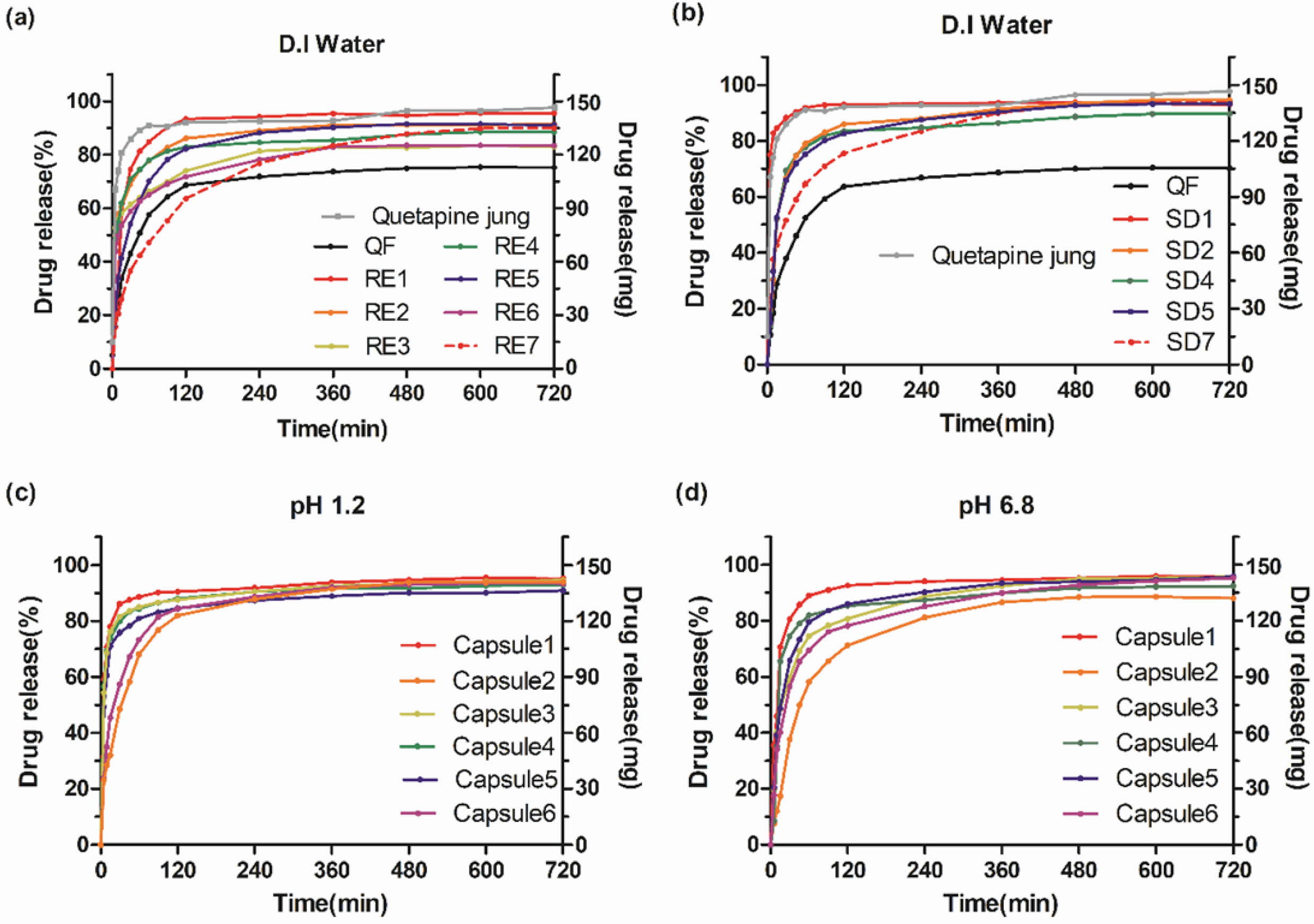 [D.I water] (b); capsules [pH 1.2] (c); [pH 6.8] (d). |