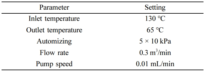 좋은 포접률 및 이상적인 용출패턴을 갖는 배치를 Table 2에 명시된 조건으로 분무건조(spray dryer SD-1000, Eyela, 일본)하여 제조하였으며, 사용 전까지 데시케이터에 보관하였다.