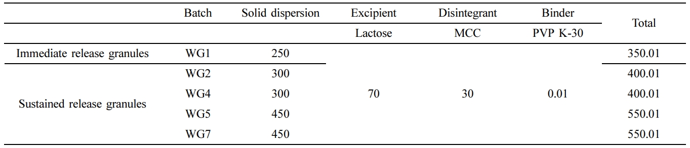 가용화제인 폴리비닐피롤리돈(polyvinylpyrrlidone, PVP) K30을 담체로 하는 고체분산체를 만들어 습식과립 공정 후 속방성 과립물을