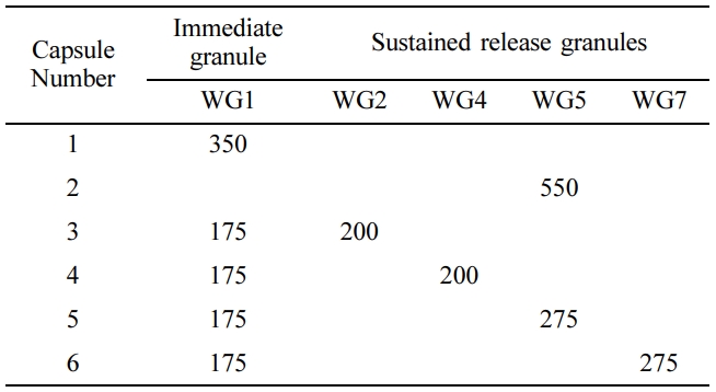 pH의 변화에도 일정한 방출을 유도하기 위해 속방 및 서방성 과립물을 이용한 캡슐을 제조하였다.