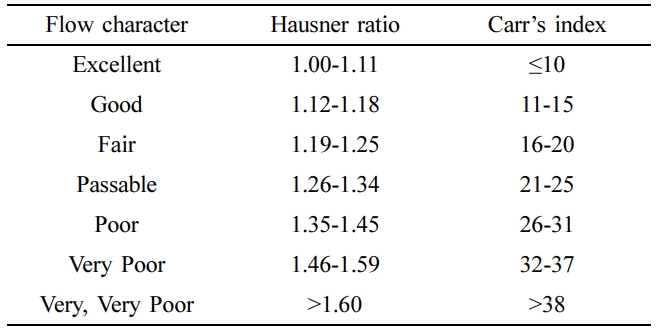 Hausner Ratio, Carr’s Index 지표로 유동성특성을 판단했다.23,24