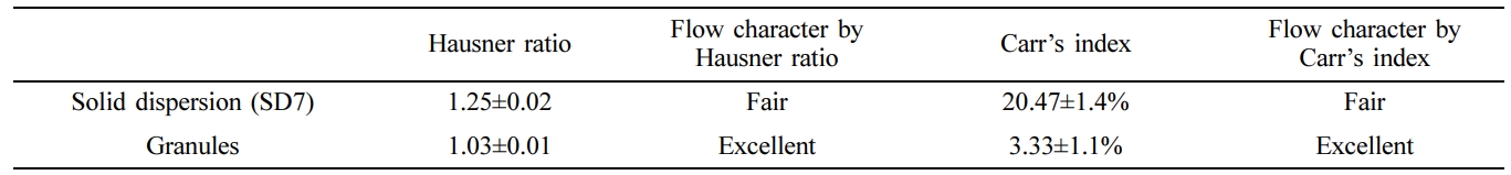 Table 6에 나타내었다. 고체분산체 SD7의 경우, Hausner ratio 지수는 약1.25±0.02로 측정되었고, 흐름성 특성은 fair