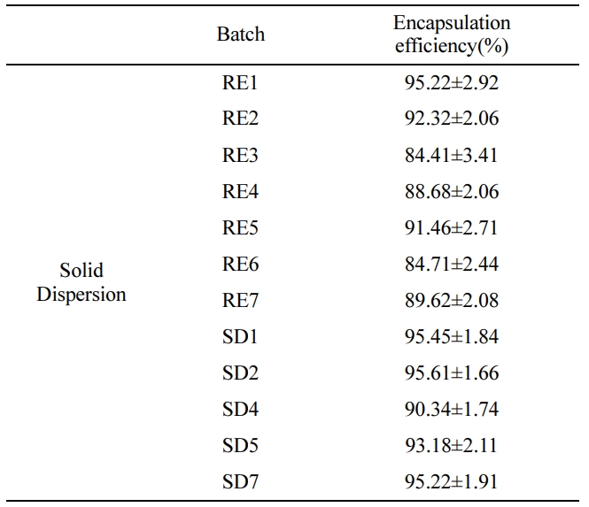 고체분산체의 포접률 분석. 분무건조기와 회전증발기를 통해 제조한 고체분산체들의 포접률은 Table 7에 나타내었다. 고체분산체를 제조하는데에 있어서의 변수인 용매제거의