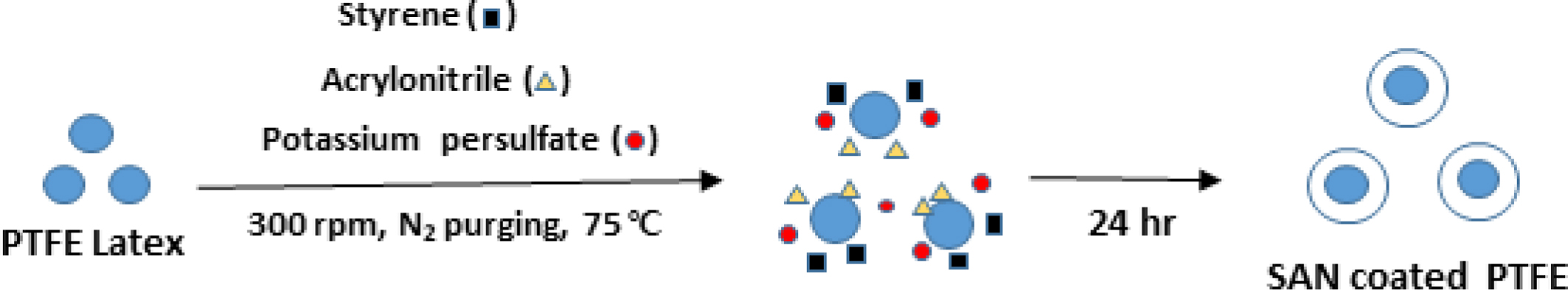 PTFE(SAN-PTFE)가 얻어진다. Figure 1에 SAN으로 코팅된 PTFE의 제조방법을 나타내었다. SAN인 shell의 두께를 조절하기