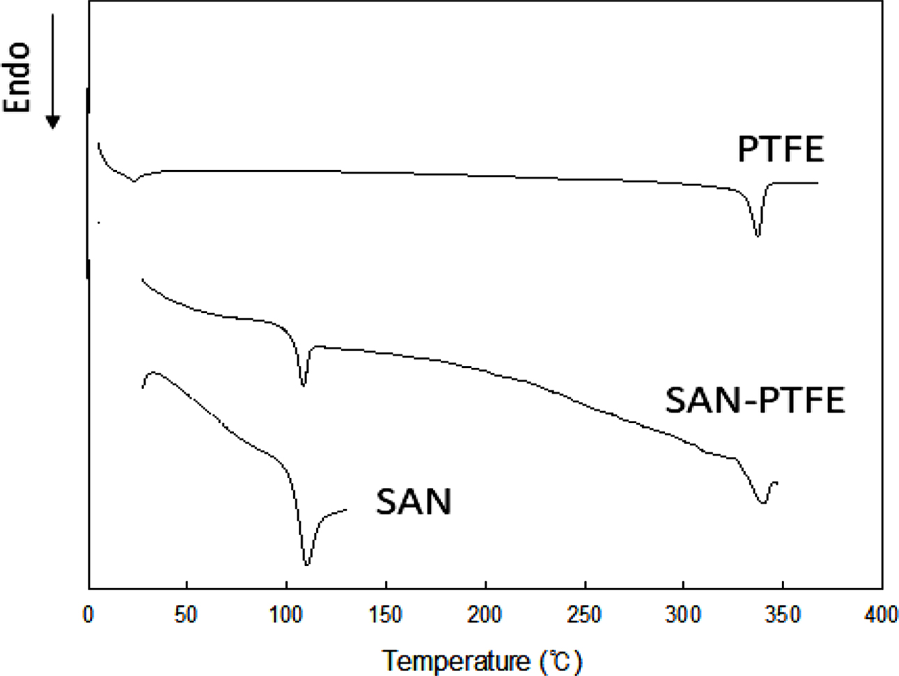 하여 Mark-Houwink식을 사용하여 분자량이 398000 g/mol로 계산되었다. 중합한 SAN의 유리전이온도는 98 oC로 측정되었고 공급받은 PTFE latex는 건조 후에 측정한 결과 330 oC의 용융온도를 나타내었다. 또한 제조된 SAN-PTFE는 98 oC에서 SAN의 유리전이온도와 330 oC의 PTFE의 용융온도가 같이 나타나는 것으로 보아 core인 PTFE에 shell인 SAN이 코팅된 것을