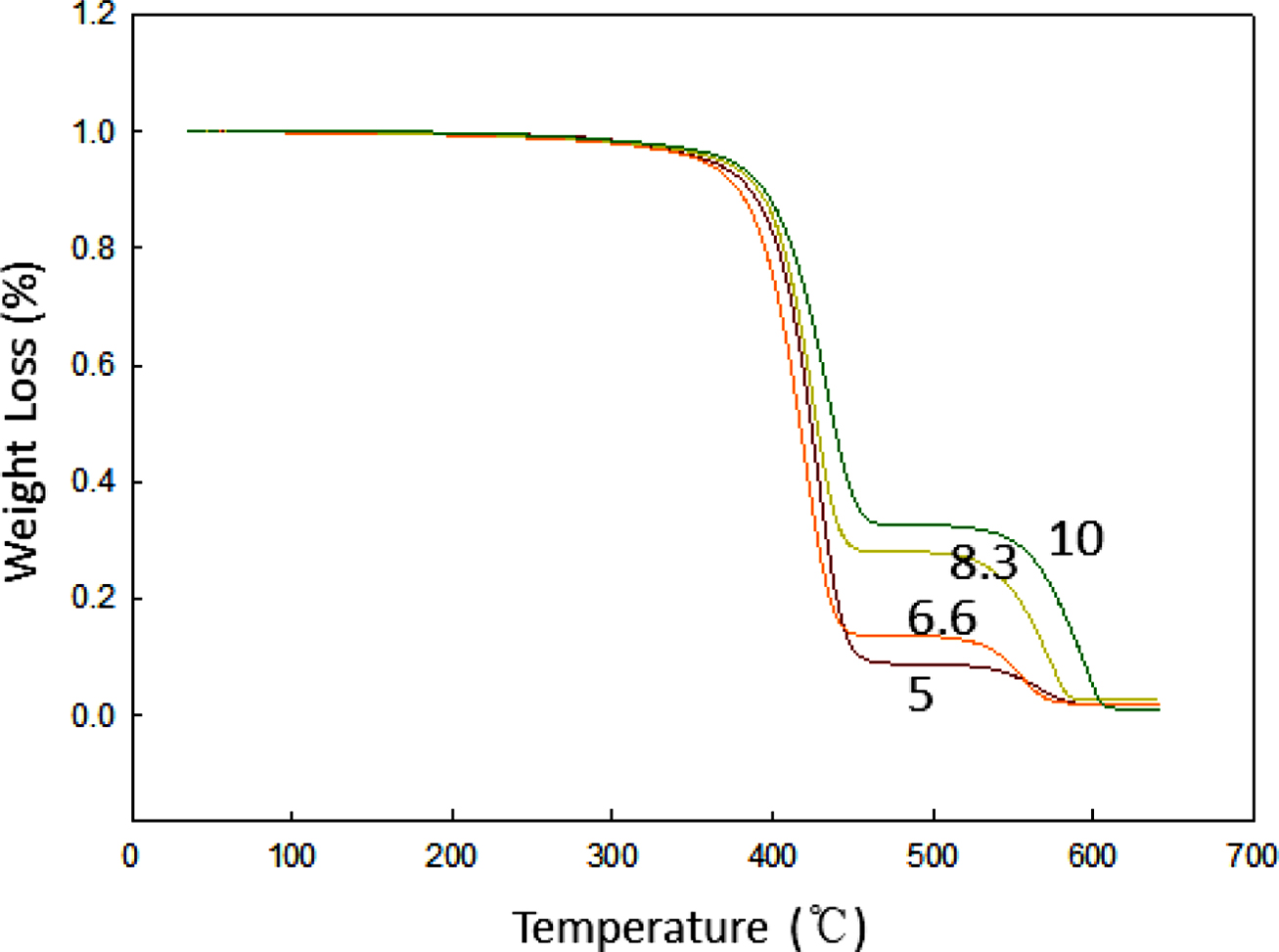 Q500)를 사용하였고 승온 속도 20 oC/min으로 하여
