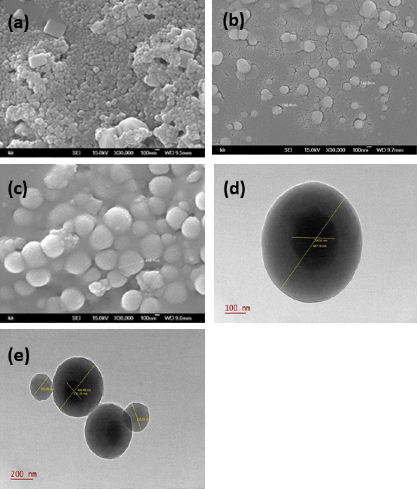 light scattering) 장비를 이용하여 평균 입자 크기를 측정하였고 형태학을 관찰하기 위해 주사전자현미경(SEM)과 투과전자현미경(TEM)을