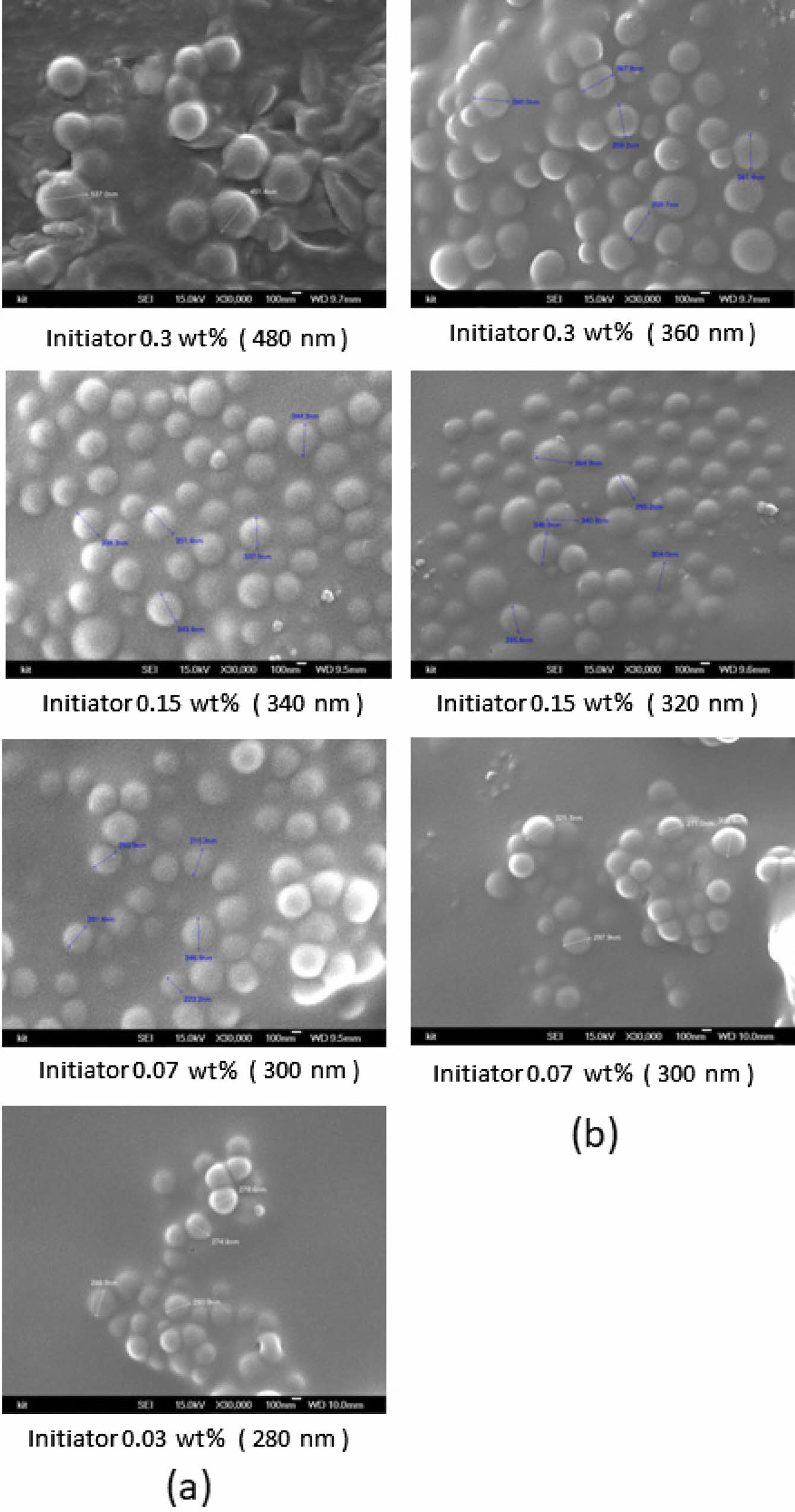 함량이 증가하면 같은 0.3 wt%의 개시제 함량에서도 입자의 크기가 480 nm에서 360 nm로 감소하는 것을 보이고 있다. 결국 PTFE의 입자의