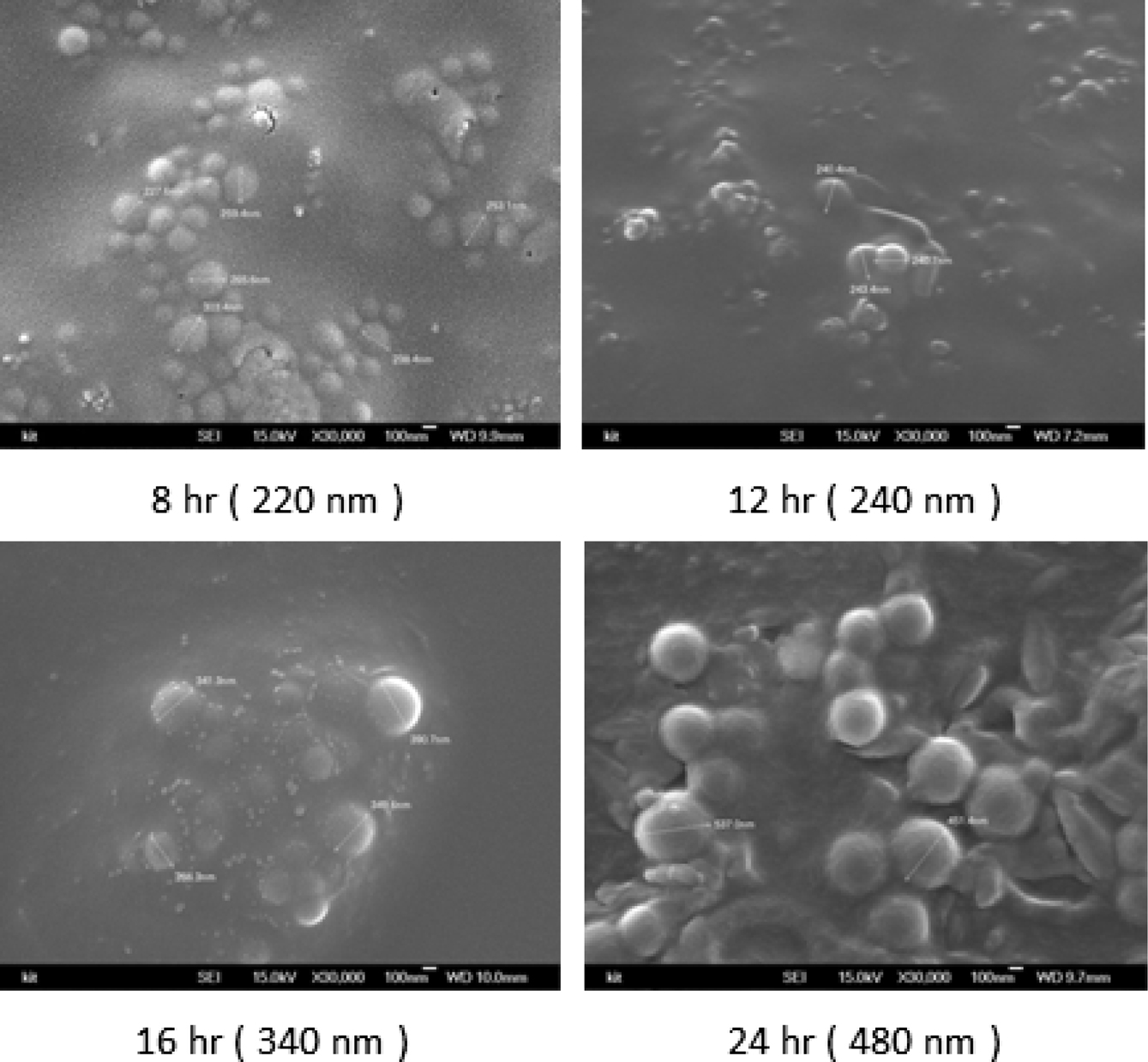 SAN의 중합시간을 달리하여 PTFE 5 phr로 제조된 SAN-PTFE 입자의 SEM 사진을 보면 중합시간이 증가하면서 입자의 크기도 220 nm에서 480 nm로 증가하는 것을 알 수 있다. 이상의 형태학으로