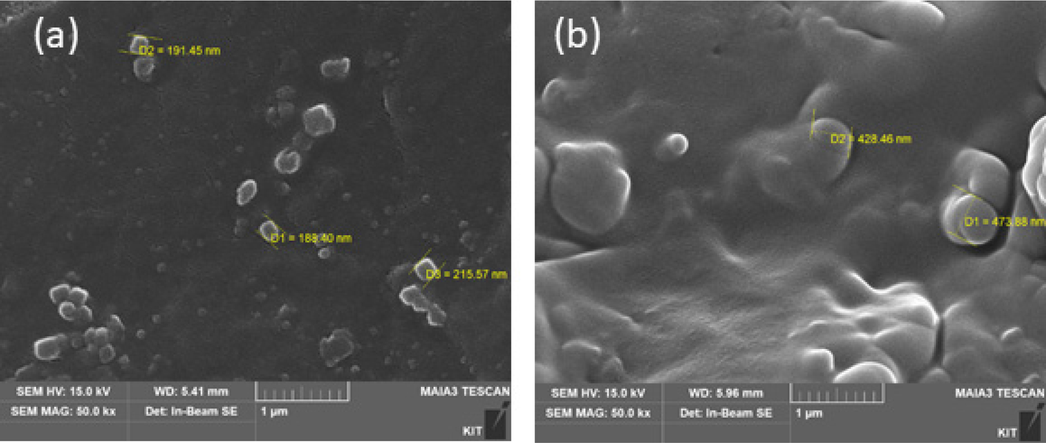 5 phr과 10 phr로 제조된 SAN-PTFE 입자의 SEM 사진을