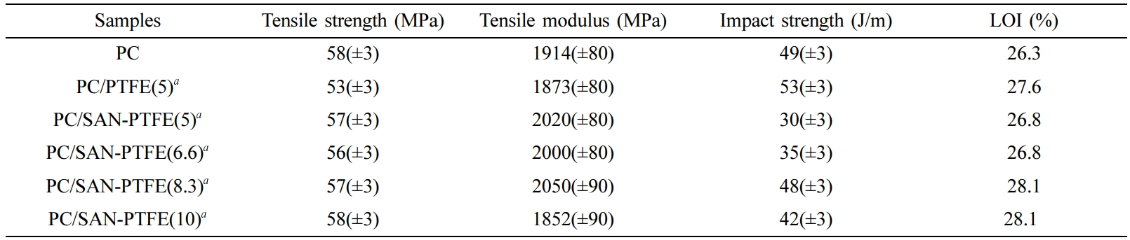 얻을 수 있었고 그 영향에 따라 PC/SAN-PTFE 복합체의 기계적 성질과 난연성이 다르게 관찰되었다. 특히 8.3 phr의 PTFE를 함유하는 PC/SAN-PTFE 복합체는