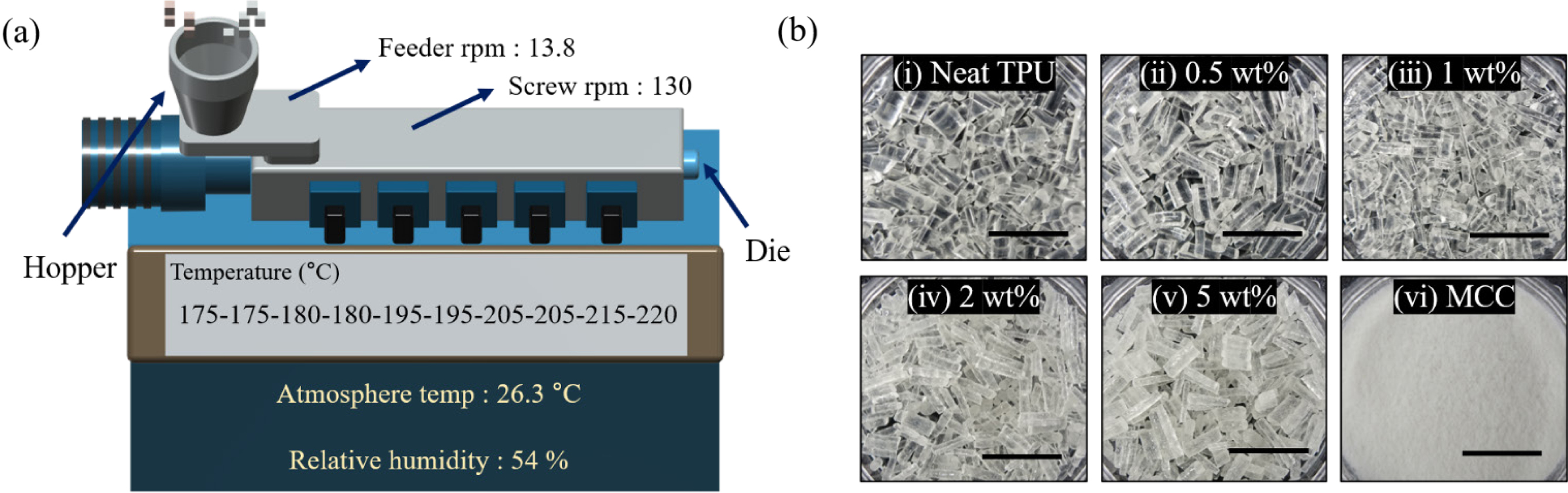 Extrusion process of TPU/MCC composites. (a) diagram of the extrusion process and the extrusion conditions including feeder rpm, main screw rpm and temperature of heating barrels; (b) photographs of neat TPU, the extruded composites, and MCC. The scale bars denote to 1 cm.