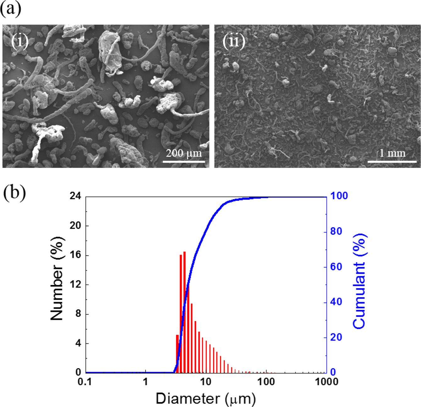 Characterization of MCC utilizing SEM and PSA. (a) SEM micrographs of MCC employed as reinforcement (i) high magnification micrograph at ×130; (ii) low magnification micrograph at ×30. (b) A particle size distribution histogram of MCC dispersed in deionized water by particle size analysis.