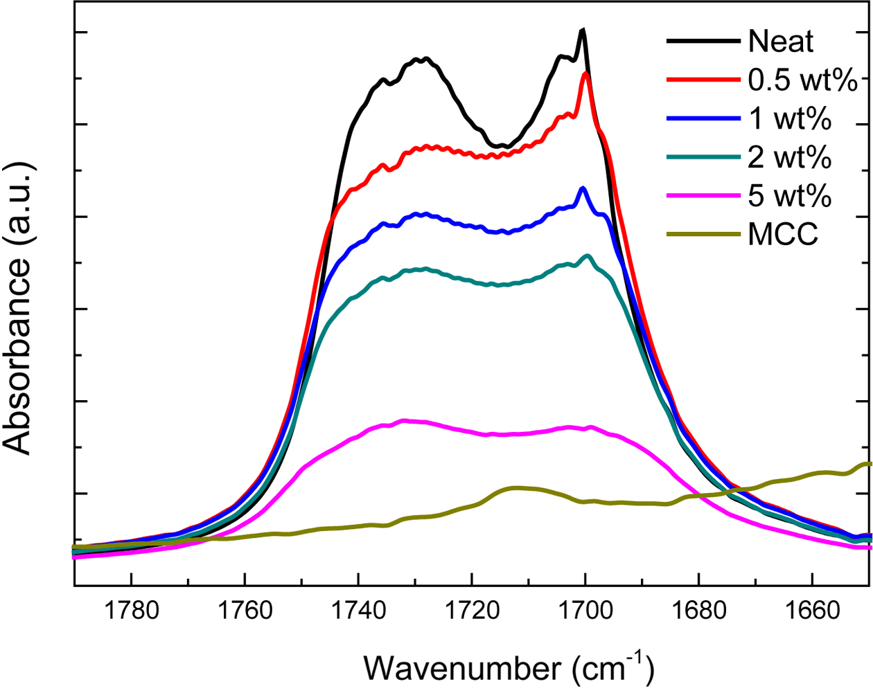 적외선 분광 분석(IR Spectroscopy). FTIR spectrometer를 이용해 neat TPU, MCC, MCC를 함량별로 첨가한 복합체의 흡광도를 분석했고 측정 스펙트럼은 Figure 4에 나타냈다. MCC의 함량(0.5, 1, 2, 5 wt%)에 따른 TPU와의 상호작용 및 수소결합 정도를 알아보기 위해 1775-1715 cm-1(Area 1)을 기준으로 1715-1665 cm-1(Area 2)의 피크 면적 비율을 식 (1)을 이용해 계산하여 Table 1에 나타냈다.17,18